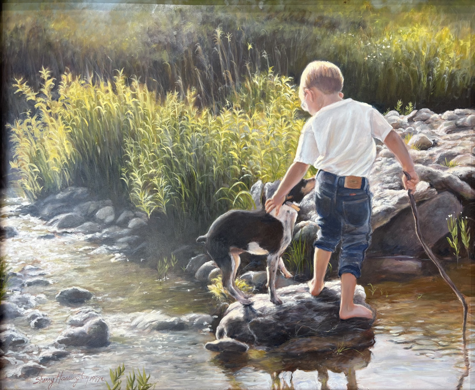 Sherry Harrington Young Boy with Dog in Stream Oil on board 20 x 24